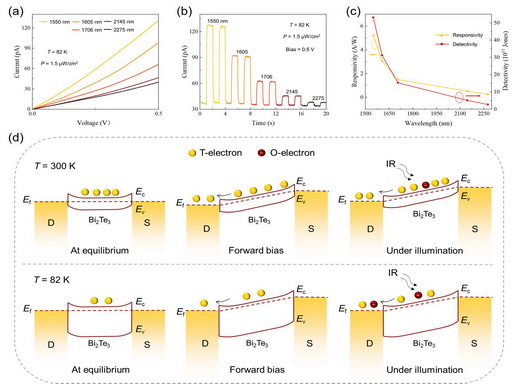 The Bi2Te3 photodetector showed excellent infrared photodetection ability under the irradiation of 1550 nm light source, which was due to the high crystal quality and the in-situ preparation of the device. In addition, the detection performance of the device was significantly improved at lower temperature, and its specific detectivity (D*) significantly increased to 7.52×1012 Jones at 82 K. This is mainly due to the low temperature suppressing the intrinsic excitation of 2D Bi2Te3 material, which greatly reduces the dark current of the device. As a typical narrow band gap material, Bi2Te3 is more significant of this phenomenon, leading to a sensitive and stable infrared detection of the detector. This research work provides a new idea for the large-area growth of 2D materials on Si-based substrate and an important basis for the unique advantages of 2D Bi2Te3 materials for infrared detection.