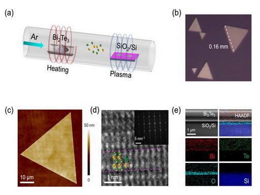 To solve this problem, the group considered that plasma pretreatment could efficiently clean the residual pollutants on the substrate surface and create nucleation sites, providing favorable conditions for the large-area growth of 2D materials. Based on this, using chemical vapor deposition (CVD) method, the group successfully realized the large-area growth of Bi2Te3 flakes on the plasma pretreated Sio2/Si substrates, with a max-size of 0.16 mm.
